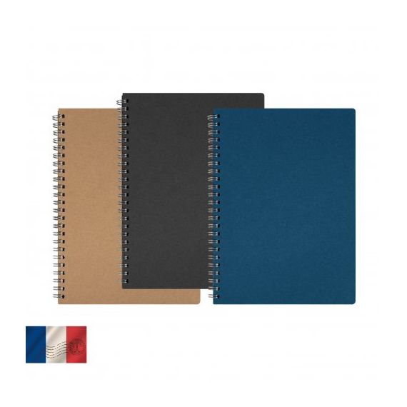 Cahier à spirale A5 publicitaire carton recyclé fabriqué en France. Couverture en carton recyclé 325gr, coins arrondis, 80 feuilles en papier recyclé 80gr, sans impression; coins droits.