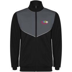 Veste avec couleur contrastée et finitions cousues sur la poitrine. Col montant avec coutures contrastées. Fermeture à glissière centrale sur le devant. Poches latérales. Poignets et taille côtelés 2x2. Pantalon avec ceinture élastique et cordon de serrage. Pièce latérale contrastée avec finition cousue. Ourlet zippé.