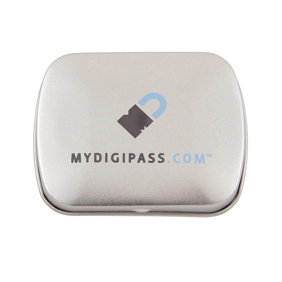 Boîte à charnières avec environ 25 gr. de pastilles la menthe ou dextrose menthe extra forte ou de minties choco mix.