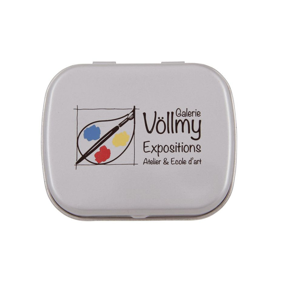 Boîte à charnières avec environ 25 gr. de pastilles la menthe ou dextrose menthe extra forte ou de minties choco mix.