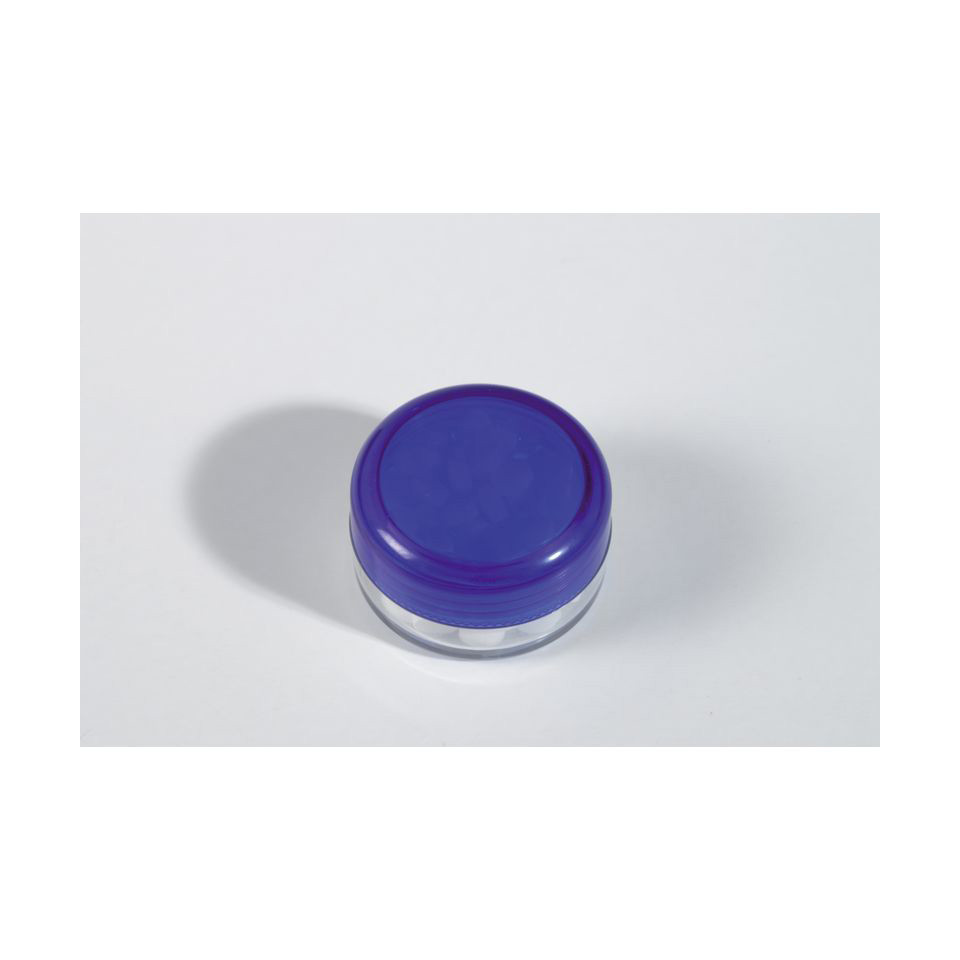 Boîte platique ronde couvercle coloré avec environ 12 gr. de pastilles sans sucre.