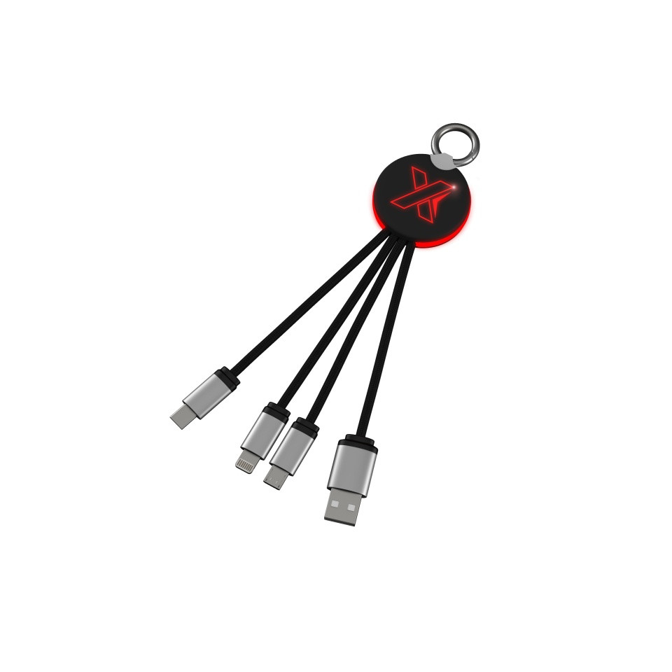 Câble rond ring light personnalisable SCX design. Câble rond avec double logo lumineux recto/verso pour type C, iPhone et Android. Finition métal.
