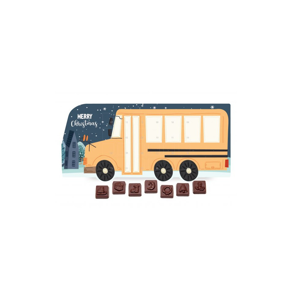 Calendrier de l’avent publicitaire en forme de Bus. Calendrier de l'Avent en forme de bus contenant 24 chocolats rectangulaires avec des motifs de Noël en relief dans chaque chocolat.