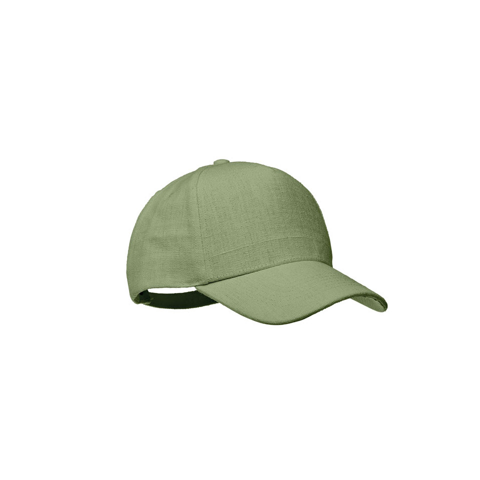 Casquette personnalisée en tissu 100 % chanvre. Casquette de baseball 5 pans en tissu 100% chanvre 370 gr/m² avec clip en laiton sur fermeture à sangle réglable.