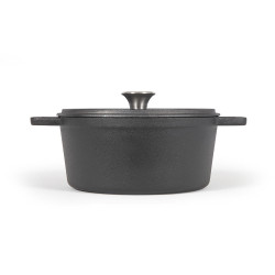 Cocotte publicitaire ronde. Fonte. Ø 24 cm. Capacité 4 L. Couvercle avec picot pour arrosage continu des préparations. Compatible tous feux dont induction. Dimensions avec couvercle + poignées (L x l x H) 32 x 25 x 14 cm ; Poids 4,400 kg