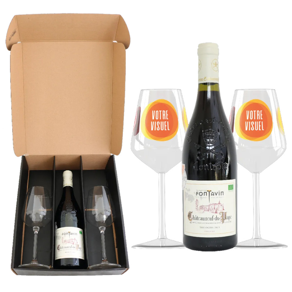Coffret vin Châteauneuf-du-Pape et verres à vin en verre publicitaires express. Nous trouvons vite des idées de cadeaux personnalisés et principalement pendant les fêtes, mais un cadeau personnalisé, unique et à déguster, ne se trouve pas de partout. Nous répondons à cette demande avec ses divers coffrets à vin, champagne et bière, qui sont accompagnés de leurs verres à personnaliser.