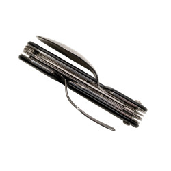 Couverts personnalisés. Couverts pliants 5 fonctions en acier inoxydable : cuillère, fourchette, couteau, ouvre-boite et ouvre-bouteille. Manche en aluminium. Système aimanté astucieux : ces couverts se scindent en deux pour former une fourchette et un couteau ou une cuillère. Marquage possible par Gravure laser 1 Manche côté gauche de 35x10 mm