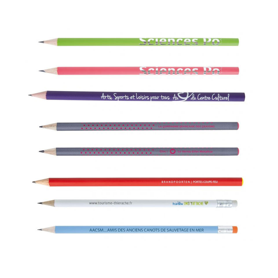 Vernis pantone de votre choix parmi les couleurs standard ou vernis pantone hors standard à partir de 500 pièces afin de décorer ce crayon de papier publicitaire et le rendre unique.