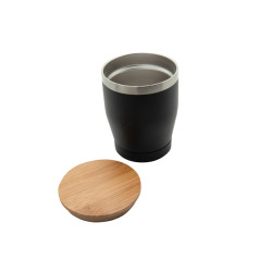 Mug personnalisé . Mug en acier inoxydable double paroi. Couvercle en bambou avec joint en silicone. Ne pas mettre au micro-ondes. Contenance : 330ml. Marquage possible par Gravure laser 1 Couvercle de Ø 80 mm