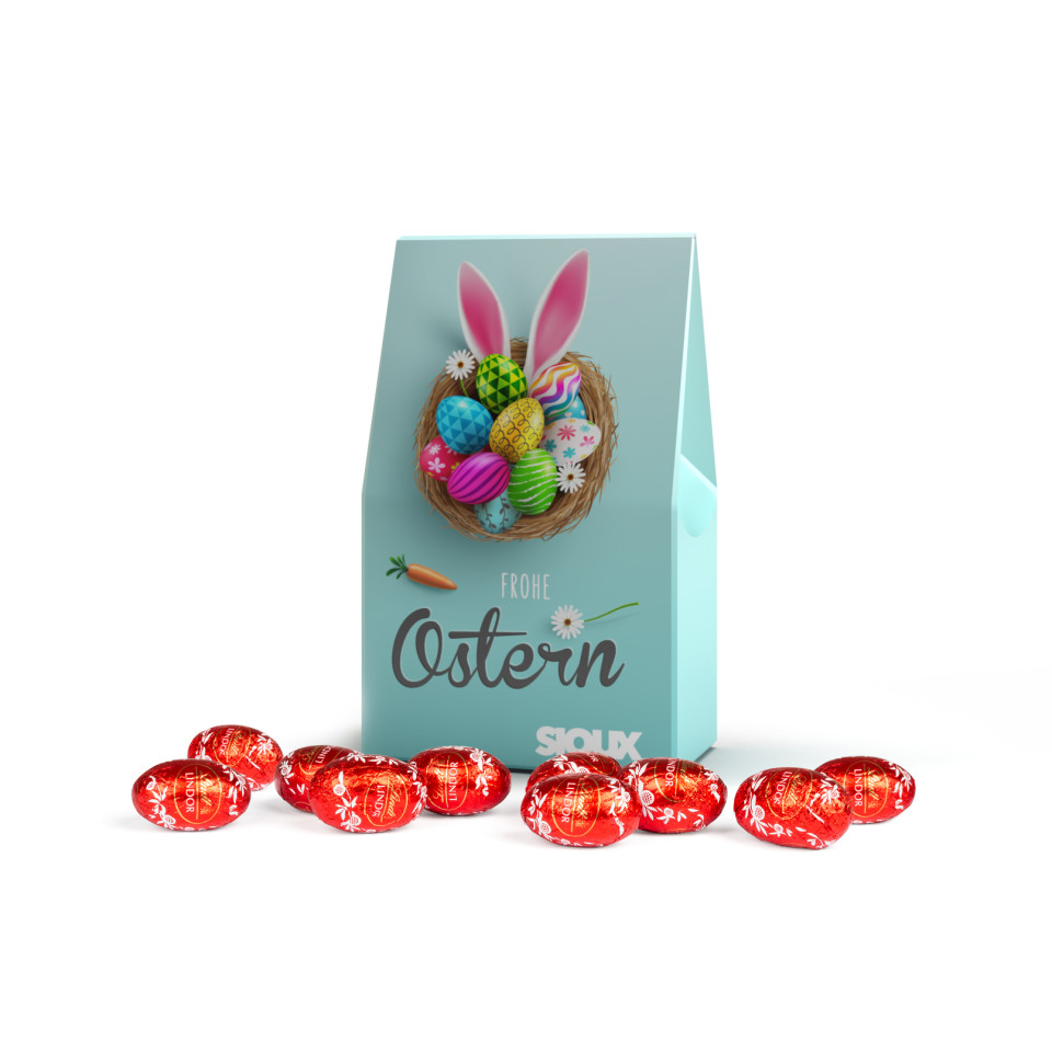 10 œufs de Pâques en chocolat au lait Lindor, emballés individuellement dans le papier d’aluminium original, et en sachet carton personnalisé en quadrichromie, avec ou sans fenêtre.