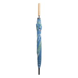 Parapluie publicitaire automatique à 8 panneaux sur mesure avec armature en métal, baleines en fibre de verre et poignée en bois. 190T pongé RPET.