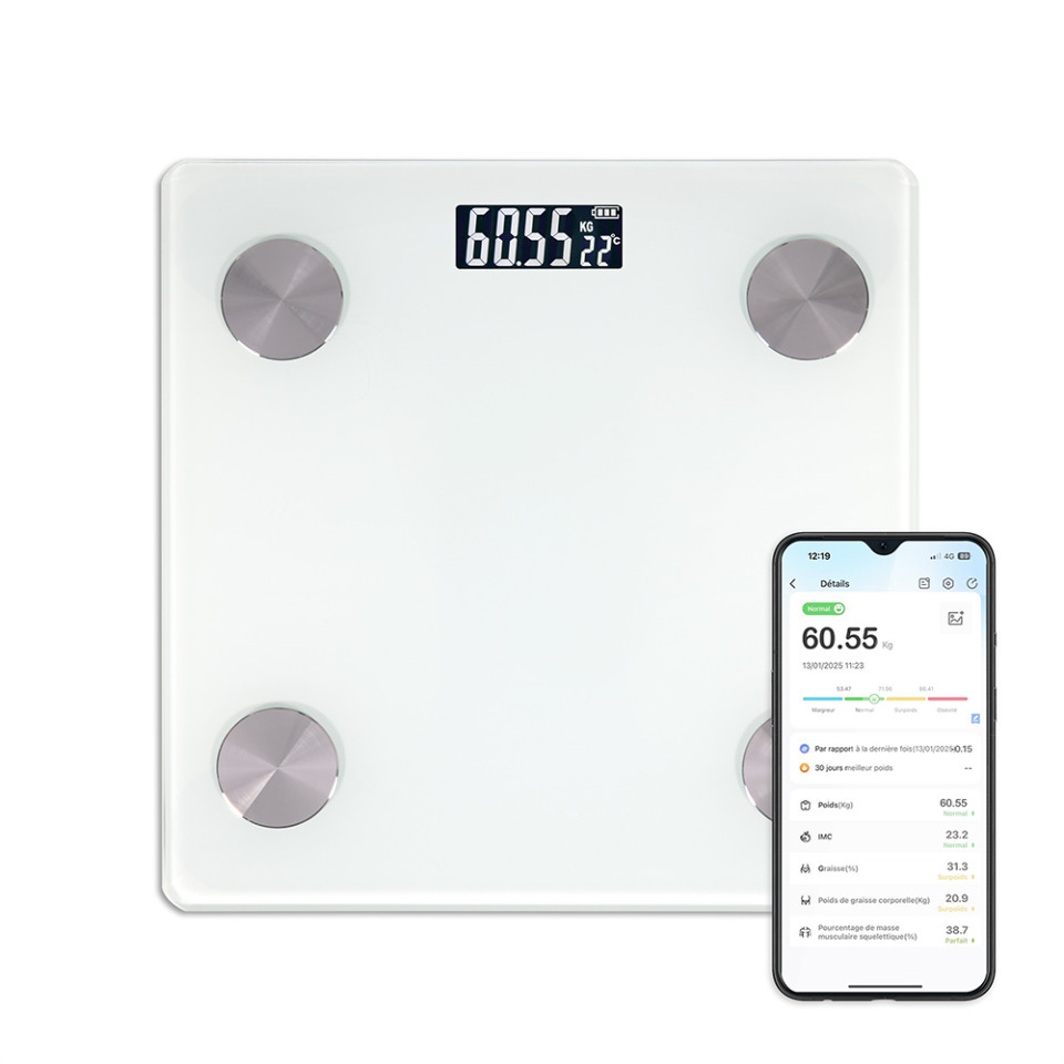 Pèse-personne personnalisable impédancemètre connecté. Suivi des indicateurs grâce à l’application OKOK compatible iOS et Android. 17 indicateurs corporels : IMC, BMR, masse graisseuse, graisse viscérale, masse osseuse, masse hydrique, masse musculaire, protéines, âge du corps, etc.