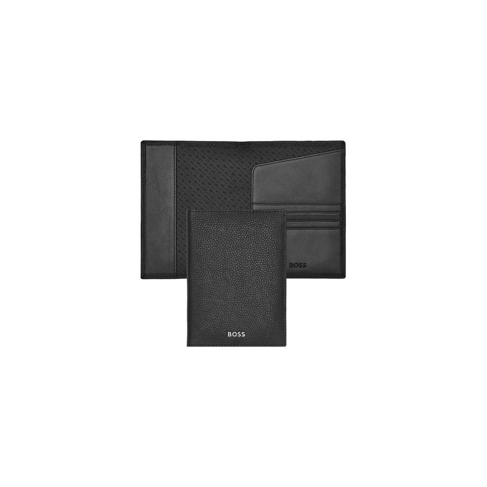 Porte-passeports publicitaire Classic Grained . La ligne Boss Classic Grained se caractérise par des cuirs pleine fleur soigneusement sélectionnés et des designs minimalistes. Toutes les pièces sont habilement assemblées et subtilement finies avec une plaque de la marque chromée ainsi qu’une doublure imprimée en monogramme. Chaque design est disponible en noir, marine et camel.