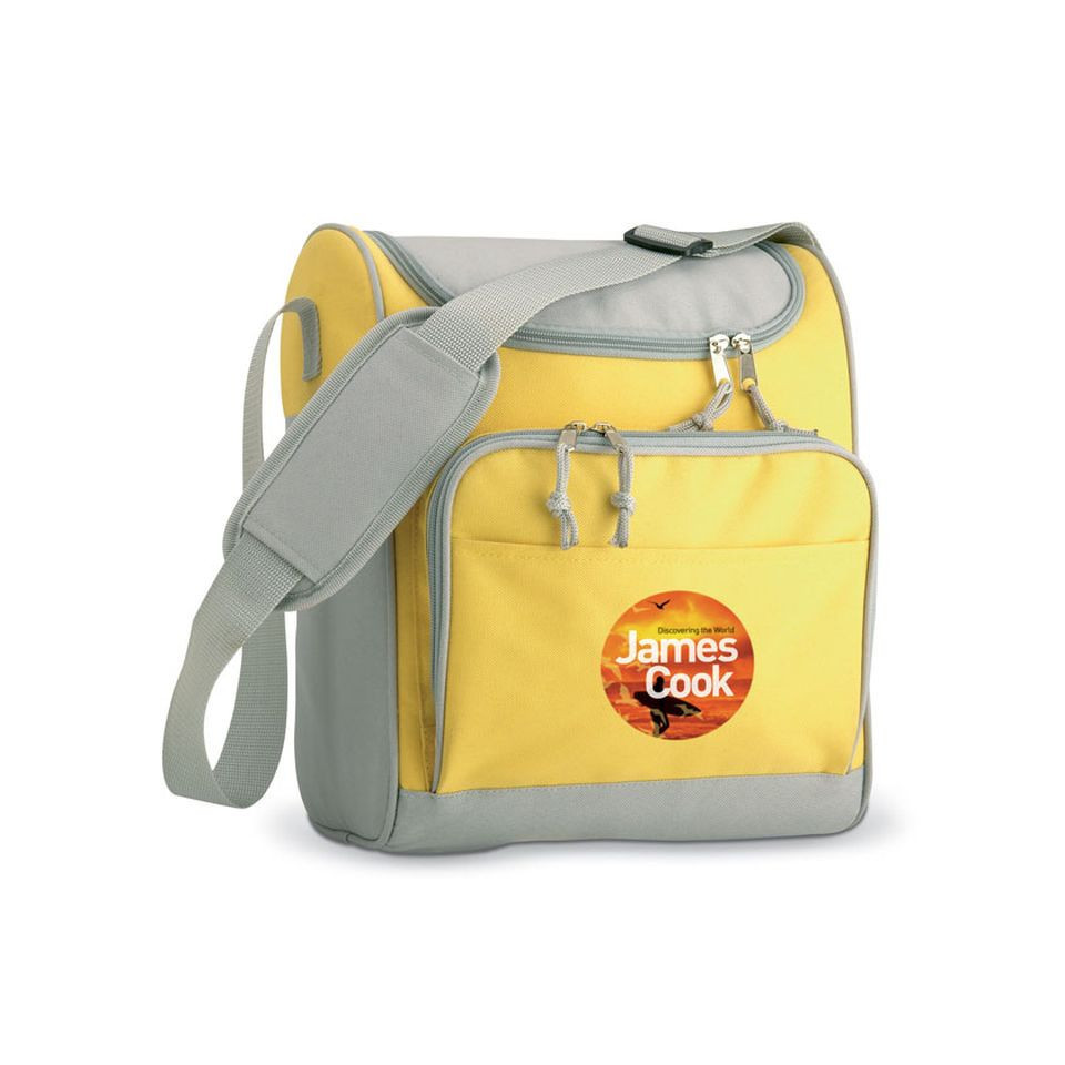 Sacs isothermes publcitaires avec poche avant. 600D polyester. Sac isotherme personnalisable à provisions ultra fonctionnel.