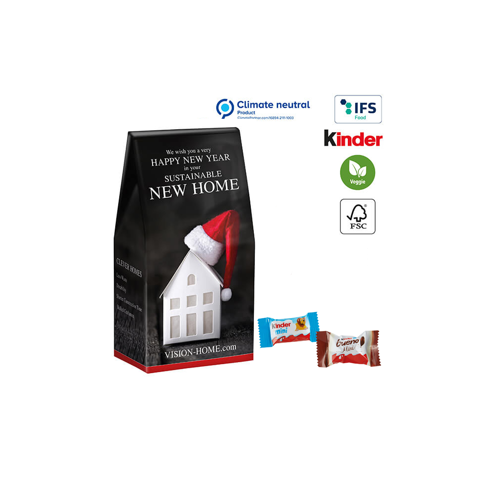 Sachet en carton publicitaire avec chocolat Kinder mini et kinder bueno Veggie fabriqué en Europe.