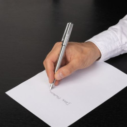 Stylo personnalisable plume Label. La ligne Label a été conçue en l'honneur des nouveaux logos audacieux de la marque, en s'inspirant de l'aspect et de la sensation contemporains, ainsi que d'une nouvelle perspective du design minimaliste. L'approche traditionnelle du logo surdimensionné est réimaginée et rendue fraîche et élégante, avec des accents raffinés et des détails monochromes. Cette version entièrement chromée est résolument moderne. Marquage possible de ce cadeau publicitaire. Demandez vite un devis personnalisé et gratuit à notre équipe commerciale !