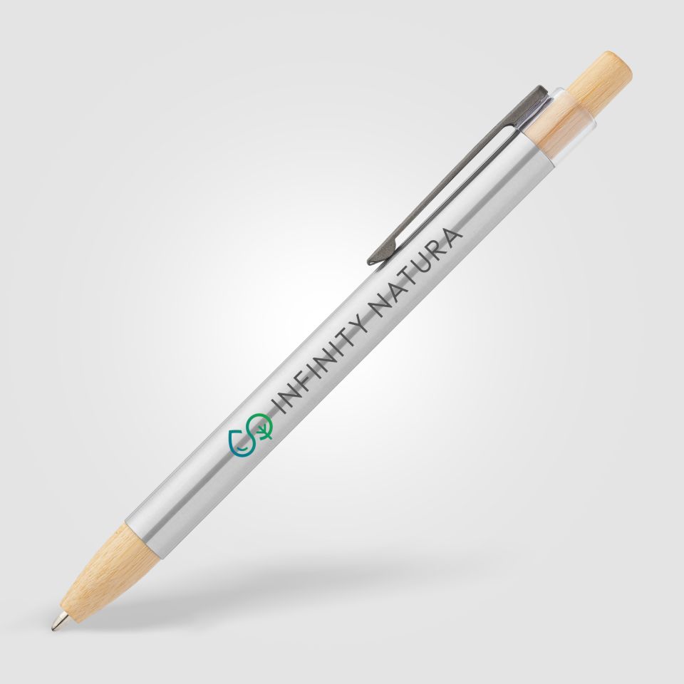 Le Stylo Nova en acier inoxydable recyclé présente un corps en acier inoxydable recyclé avec un poussoir et une pointe en bambou, offrant un contraste unique et naturel. Le plastique AS transparent met en valeur la partie supérieure près du poussoir, tandis que son clip en métal, présente une finition élégante en acier gunmetal.