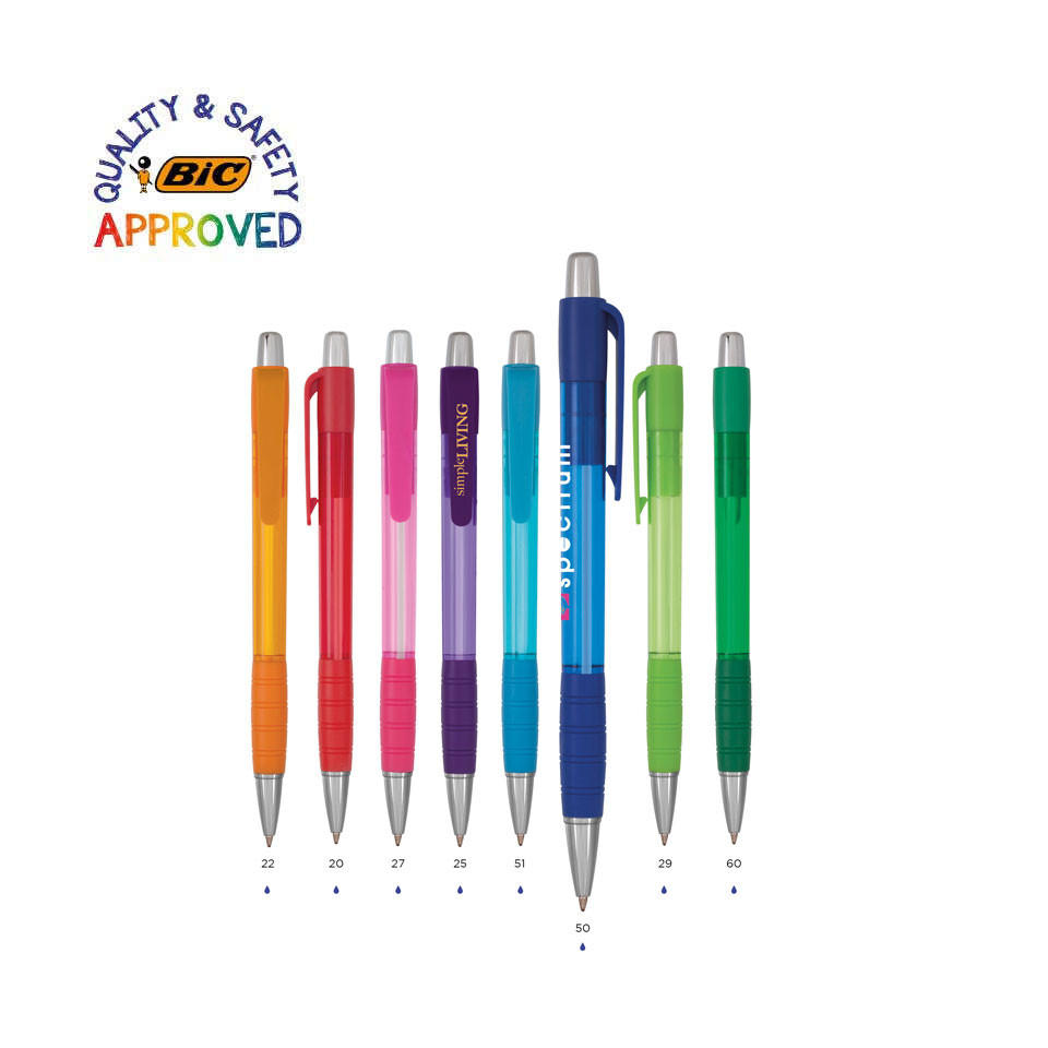 Stylo publicitaire Stiped Grip pen. Ce stylo personnalisable à bille rétractable populaire avec corps de couleur translucide, attribut de couleur solide et touches chromées.