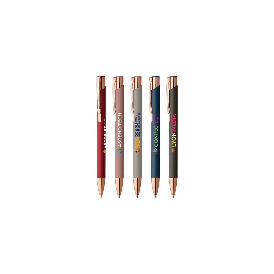 Ce stylo à bille est doté d'un corps en métal avec une finition soft touch et d'une bordure en or rose pour compléter le look contemporain et tendance de ce stylo convaincant.