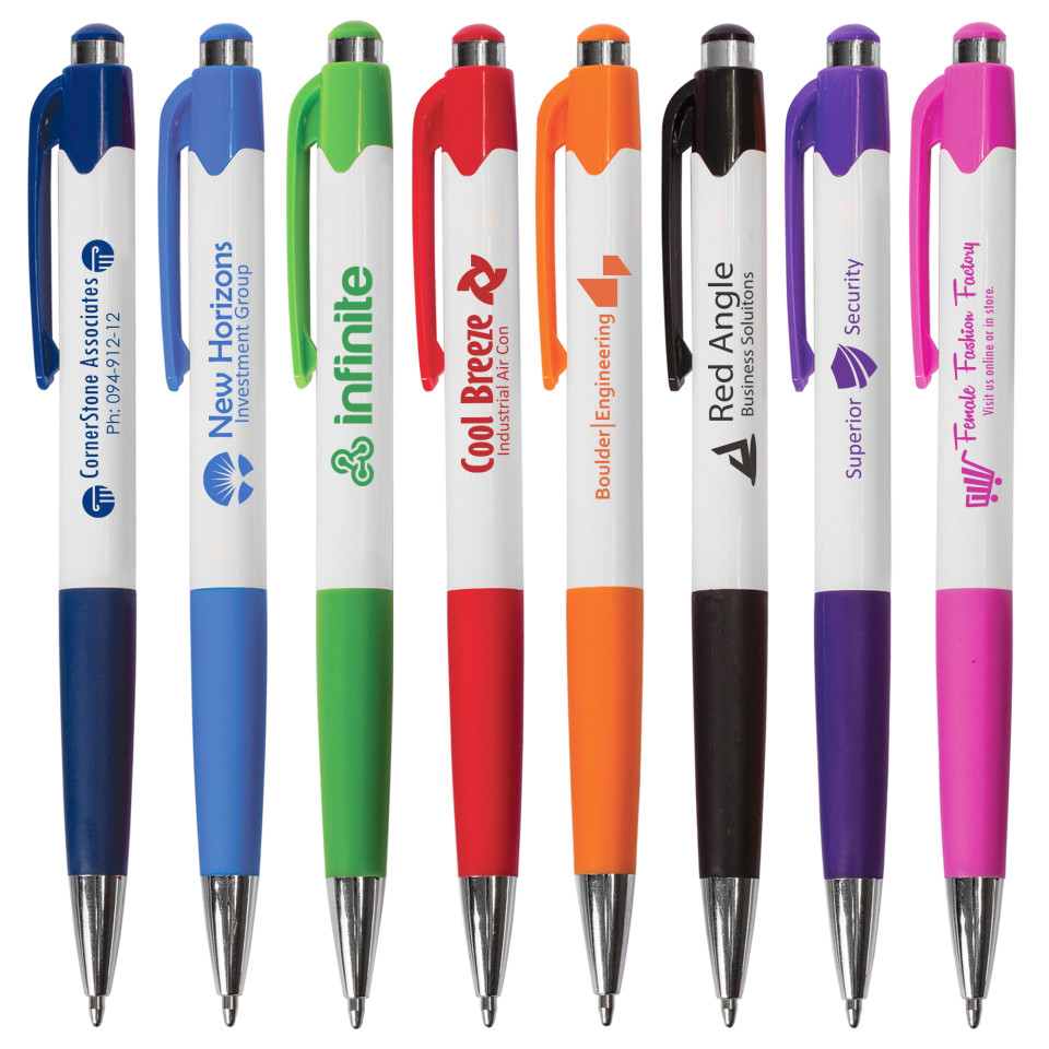 Stylo bille personnalisé express Goldstar® Lauper.  Stylo pub express en plastique Lauper est un joli stylo-bille à bouton-poussoir au corps blanc avec 8 couleurs d'attributs au choix, finitions chromées et une large surface d'impression.